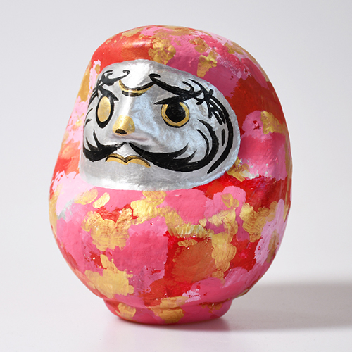 体は、だるまらしい赤とピンクに染めて、金と銀を全体的に入れて華やかな印象にしました。