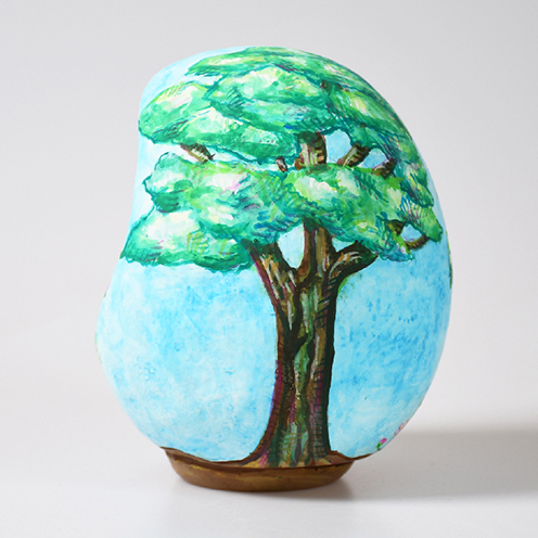 この作品のダルマの親しみと自然の安らぎから自然にもっと目を向けて欲しいという意味を込めて描いた。