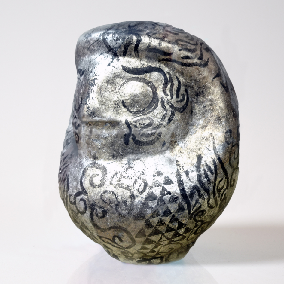 昨今の新型コロナのいち早い収束を願って疫鬼疫神を払う意味の「儺」、皆で力を合わせる意味の「戮」、病が癒える意味を持つ「閒」の三字に加え、高い殺菌作用を持ち、病をもたらすものへの対抗として素材の銀、無病息災の文字で描いた顔、生命力を象徴する唐草模様と厄除け・再生を示す鱗紋として三角形をだるまの全身にちりばめた。