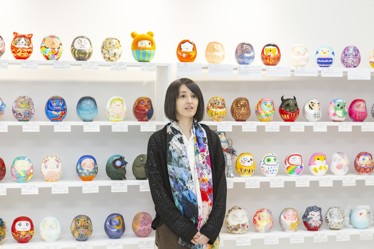 芸術祭最終日の11月3日(祝)に小松美羽さんがアートだるま展示会場を訪れ、多くの方が出展参加して頂いた「アートだるま」をご覧になりました。 「かわいい!」「すごい!」と歓声を上げながら1つ1つ見入っていました。