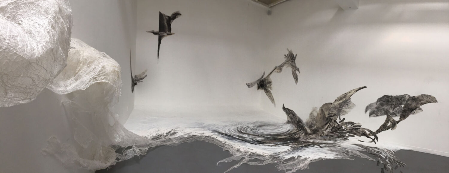 作品との偏狭的とも言える関わり方から視点を移行させ展開していくきっかけとなったのが2015年に行ったロサンゼルスでの作品発表であり、初めて訪れたかの地の場景を俯瞰的に眺めていた自分を「雲間から垣間見る」日本美術の伝統的な引き視点を用いて可視化するインスタレーションでした。