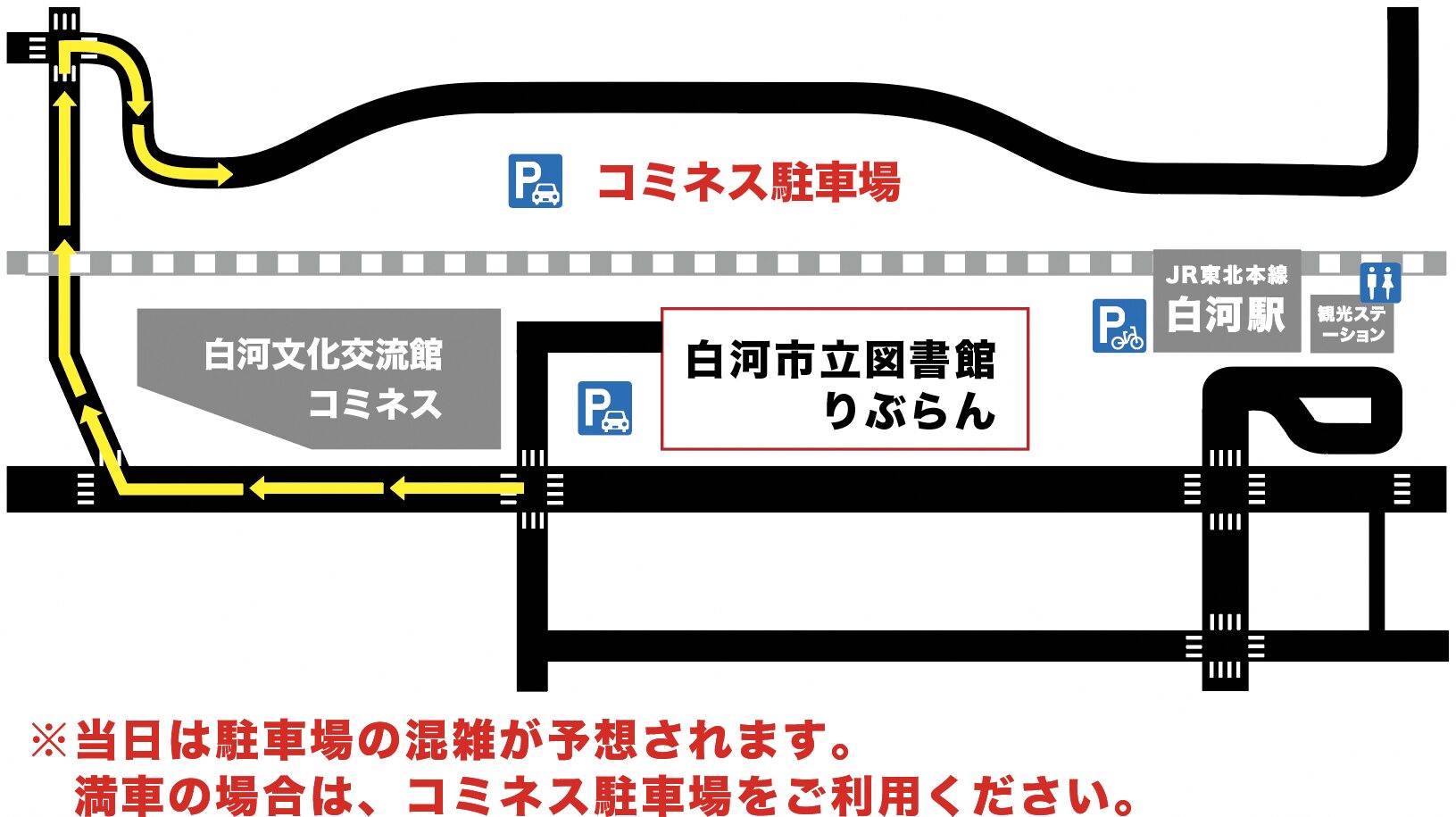 り、駐車場の混雑が予想されます。りぶらんの駐車場が満車の場合は、地図のとおり、東